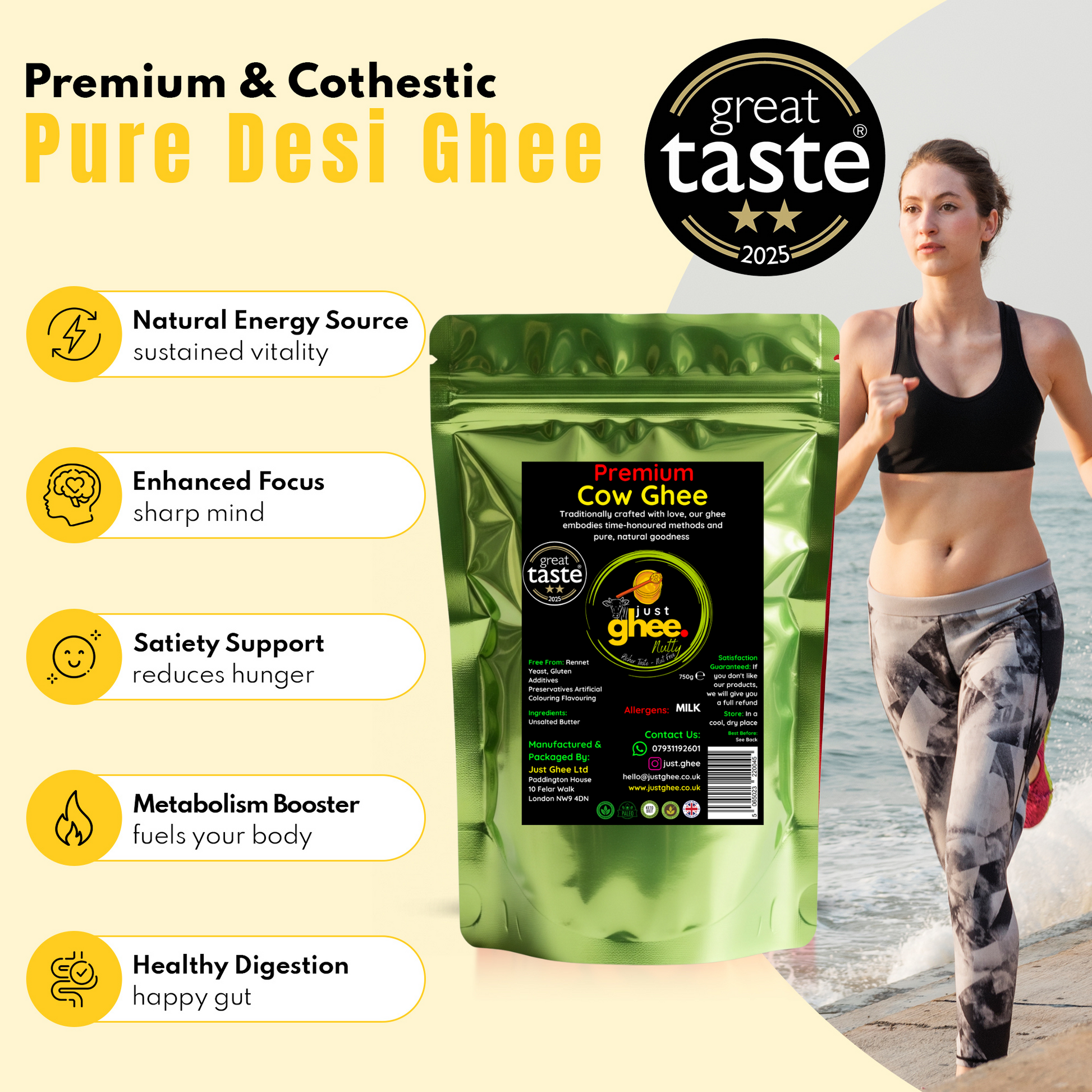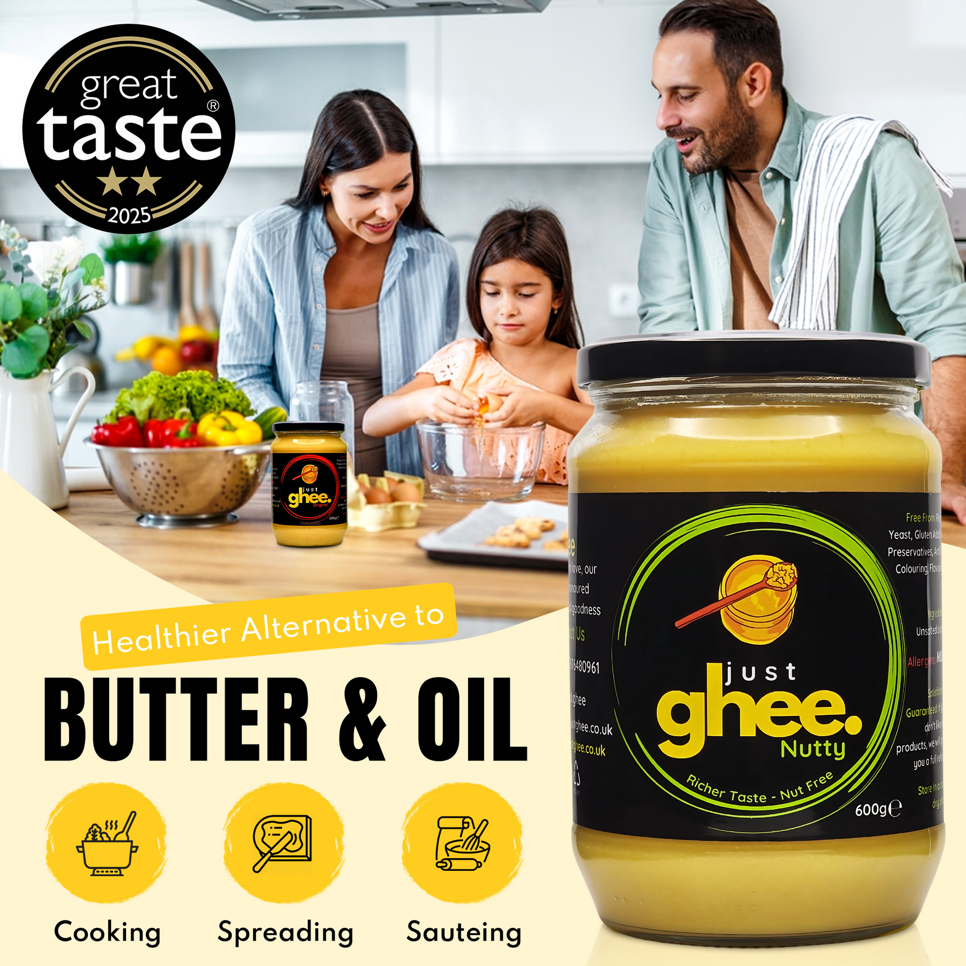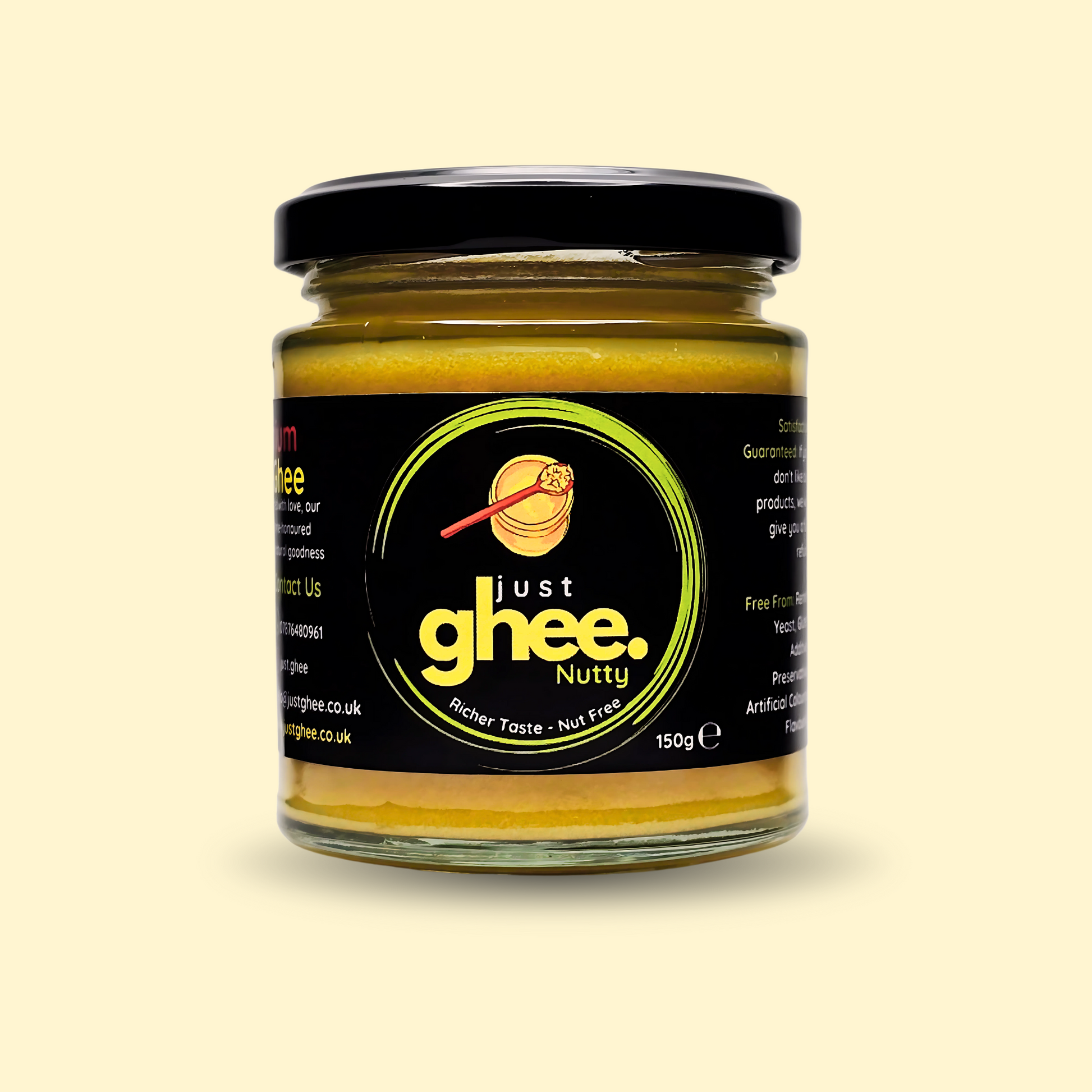 Our Nutty/Bengali Flavour Ghee contains only one ingredient: pure unsalted butter. We use the cream from healthy, grass-fed cows and turn it into ghee without adding anything else, no preservatives, no artificial colours, no flavourings. It is a completely natural product.