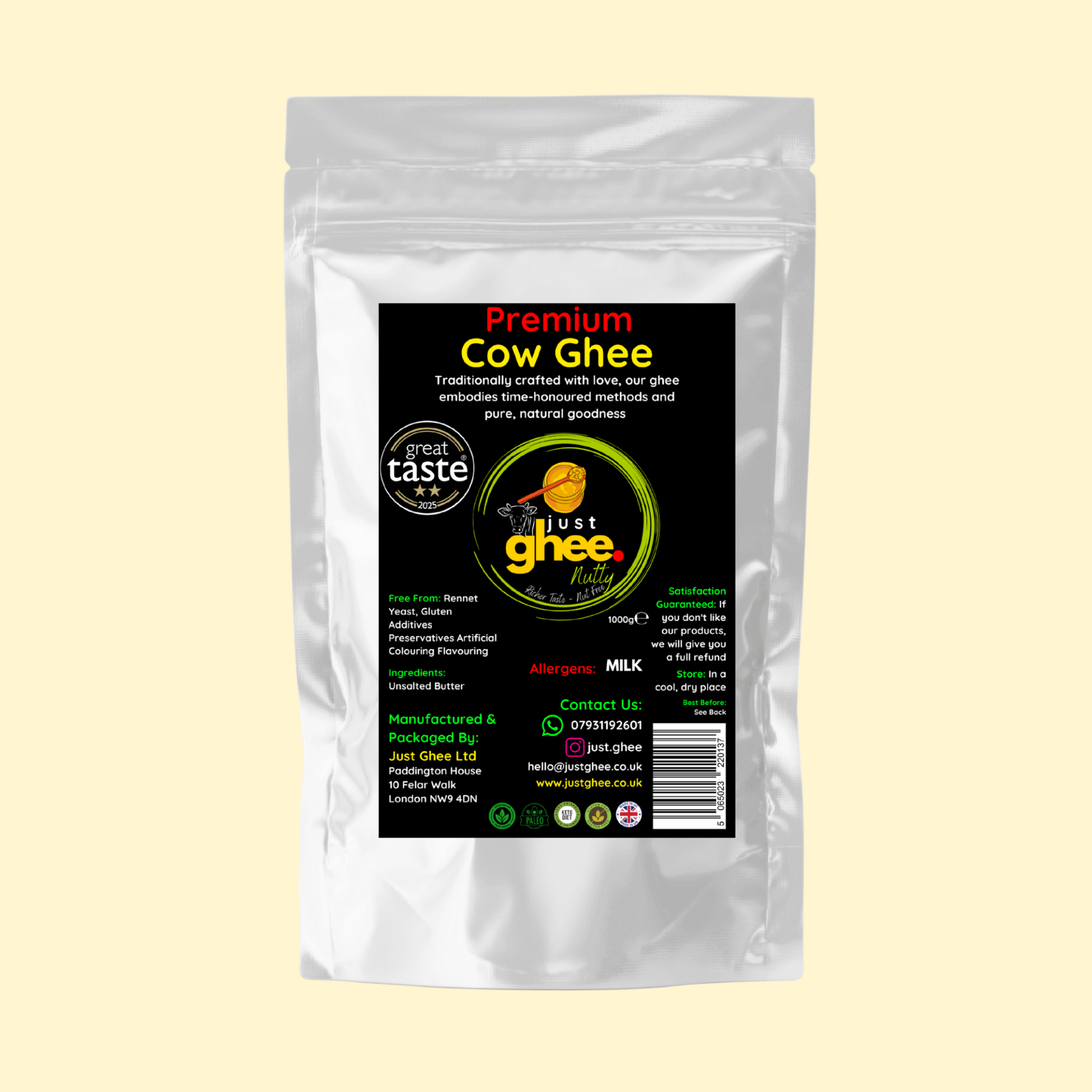 Our pouches are food-grade and designed to keep the ghee fresh and ready to use without worry.