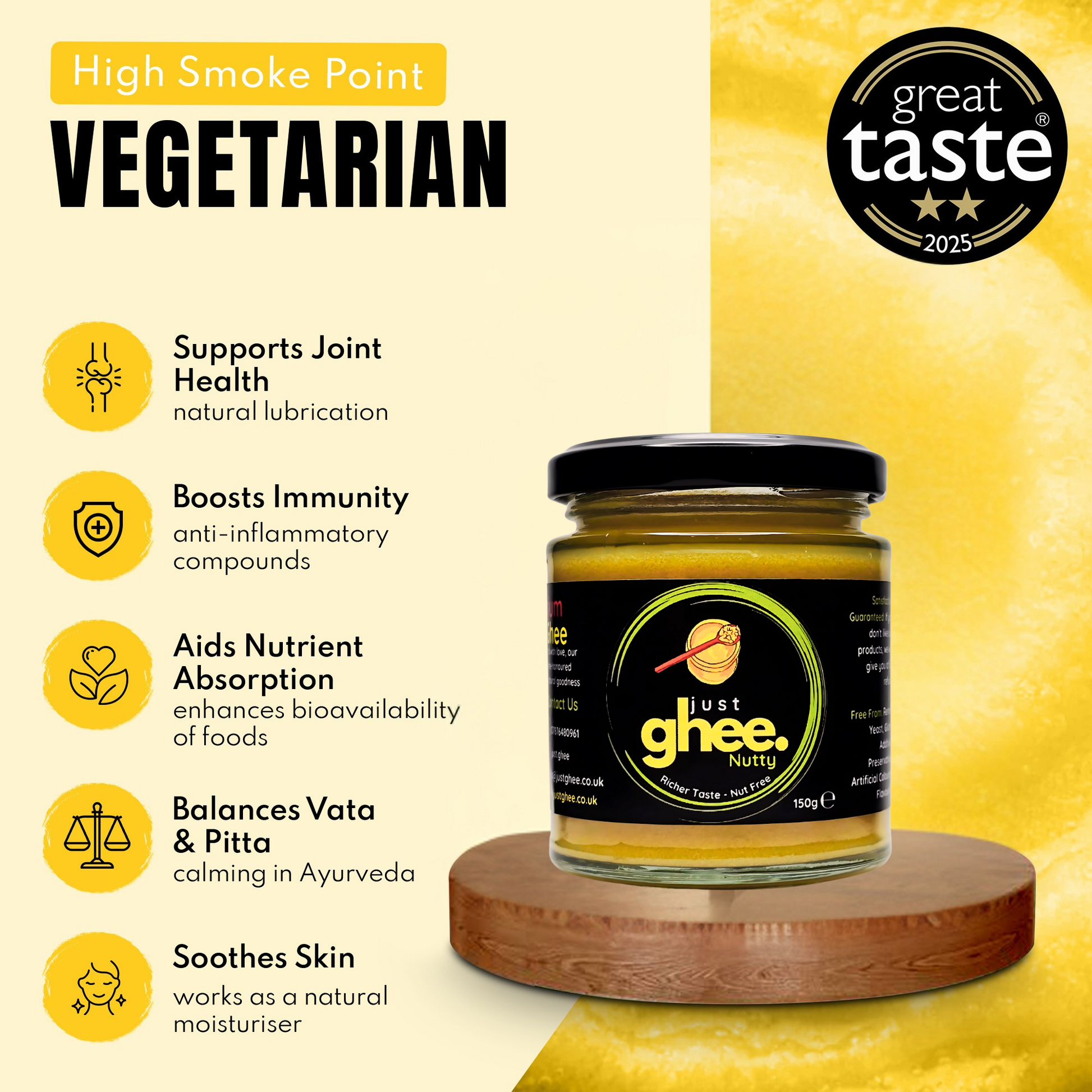 Because this ghee is cooked slowly, it holds on to its natural vitamins and antioxidants. These help to support your digestion and overall health, just like our regular ghee, but with an extra rich flavour that enhances dishes in a special way.