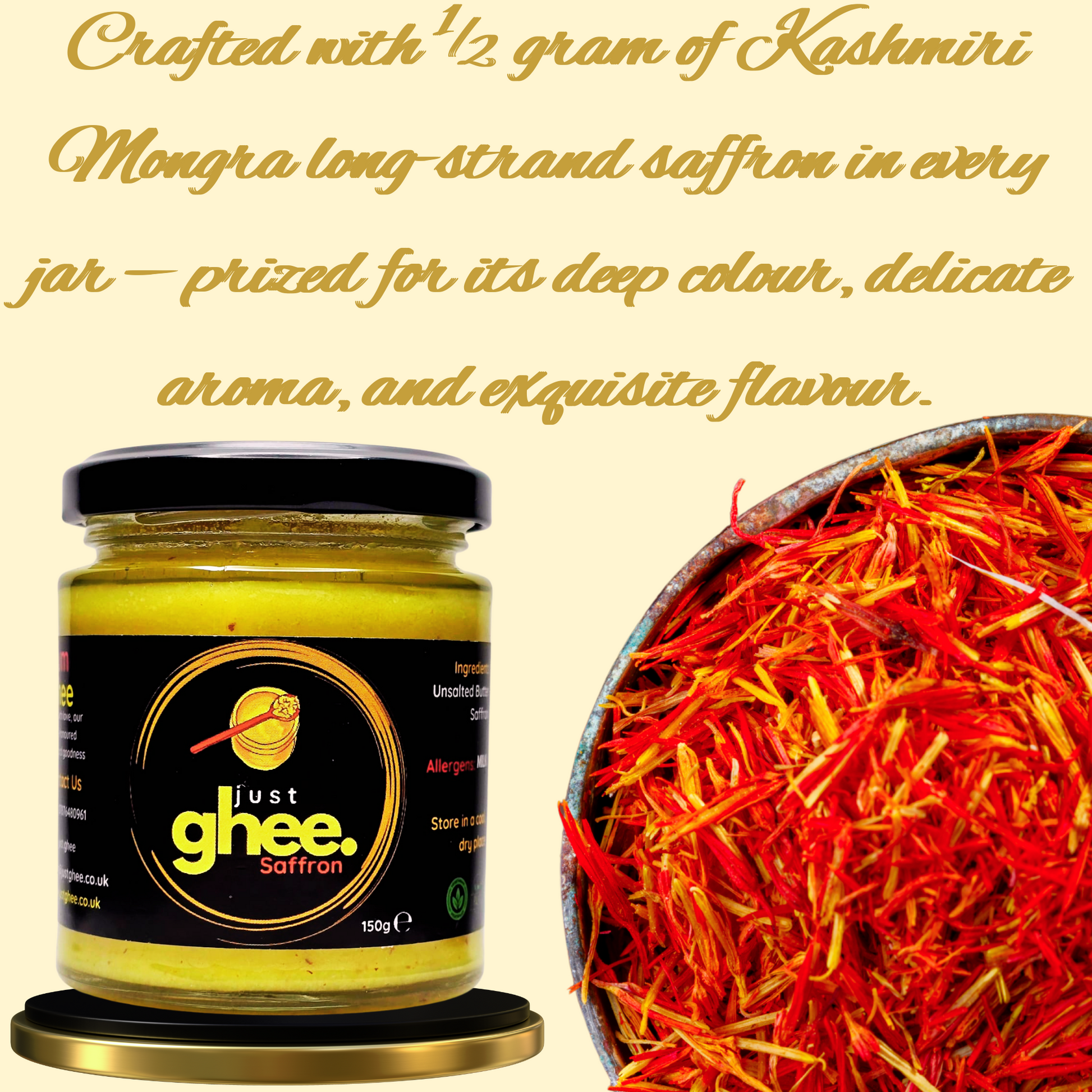 The saffron adds a mild sweetness and floral perfume without being overpowering. It blends perfectly with the buttery richness of the ghee, creating a harmony of flavours that enhance both simple and complex recipes.